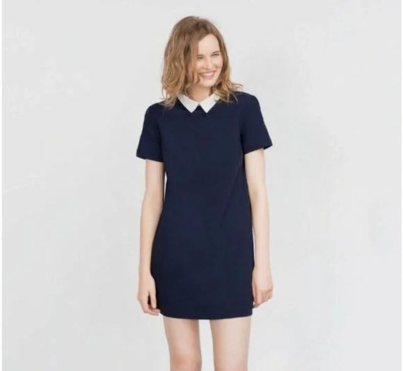 Плаття темно-синього кольору Zara з білим комірцем. Дуже красива структурована тканина . Короткий рукав, чудовий стан. Довжина 78 см