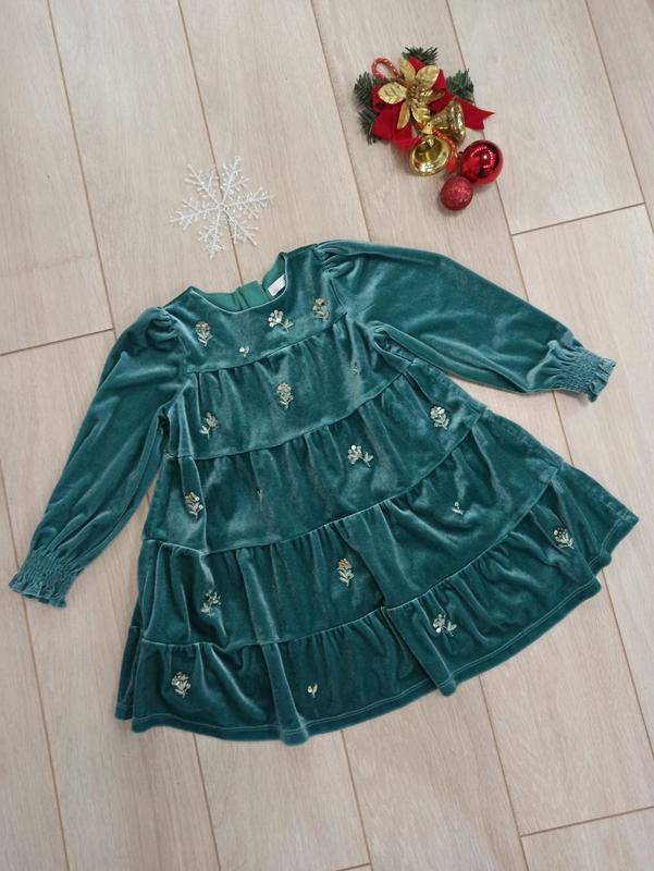 Сукня плаття святкова, новорічна, для дівчинки, з довгими рукавами, зелено-бірюзовий колір, тканина велюрова з паєтками, на дуже пниємній підкладі, Marks& Spencer, Індія. Розмір (2-3 рочки, зріст 98). Заміри: ОГ 62-66, обхват рукава в плечі 39, довжина рукава 37, довжина сукні 51.
