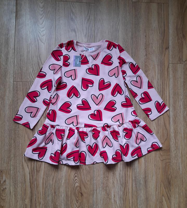 Платье в сердечки, фирмы Sinsay 104см. на возраст 3-4р., ориентируйтесь по замерам: длина от плеча до низа 51.5см., ПОГ 30.5см., рукав от плеча 35см., рукав от горловины 40см. Новая, качественная, двунитка. 100% котон. Есть безопасная оплата укр или новой почтой.