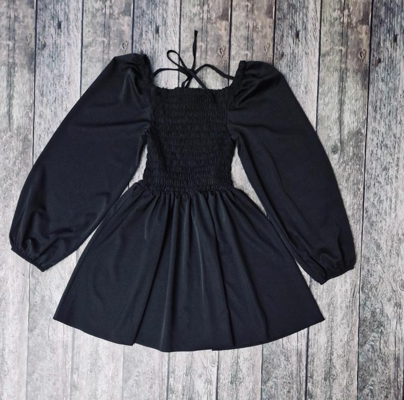 В наличии! Милое платье для девушек. Ткань - летняя легкая костюмка. Верхняя часть платья собрана под резиночки. Рукав снизу под резиночку. По спинке завязывается на завязочку. Цвет - черный. Замеры: 140 длина от плеча - 72см, полуобхват груди тянется до - 38см, рукав-55см. 146 длина от плеча - 75см, полуобхват груди тянется до - 39см, рукав-57см. 152 длина от плеча - 77см, полуобхват груди тянется до - 40см, рукав-59см. 158 длина от плеча - 79см, полуобхват груди тянется до - 41см, рукав-61см.