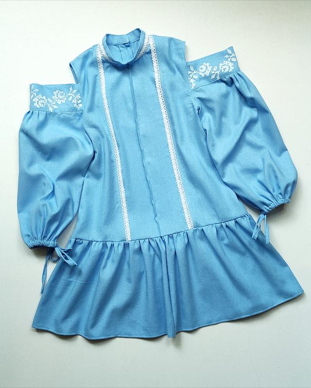 Платье цвета неба с белым декором, словно облачки ( реальный цвет удалось передать на первом фото) Авторский дизайн Спинка с изюмом 👌 Лляна тканина Размер в наличии подойдет на рост 134см + Длина 77см Плечи 32см ПОГ 40см Рукав от проймы 35см Застегивается на пуговицы по спине. P.S.Для этого манекена платье маловато, но хотелось показать как выглядит.