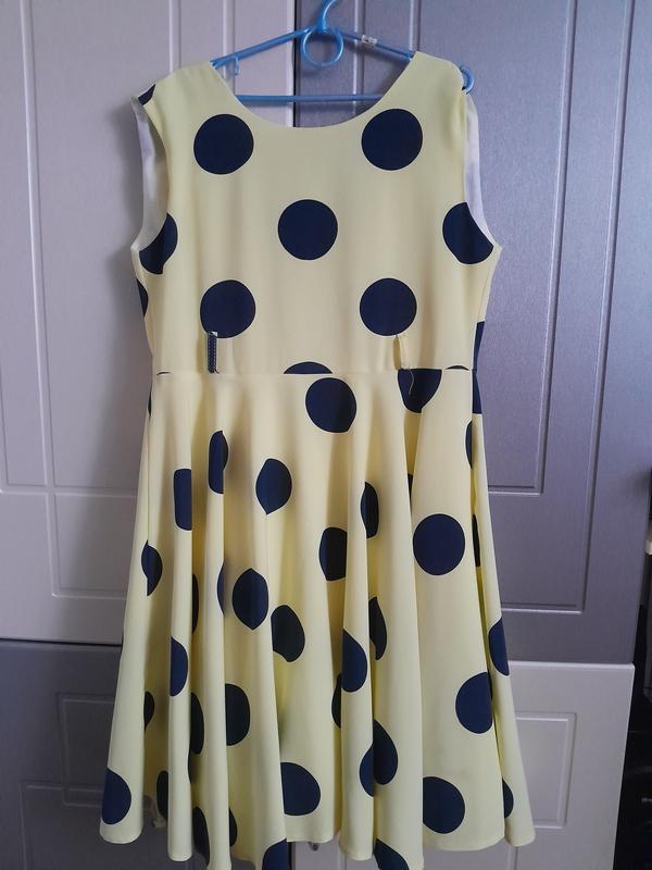 • Размер: 146 (ориентировочно на возраст 9–11 лет). • Дополнительная метка: EU 8. • Цвет: светло-желтый с темно-синими крупными горохами. • Фасон: пышная юбка, без рукавов, застегивается на молнию сзади. • Состояние: очень хорошее, без пятен и дефектов. • Материал: легкий, приятный, с подкладкой. Подойдет для праздника, выступления, фотосессии или повседневных выходов.