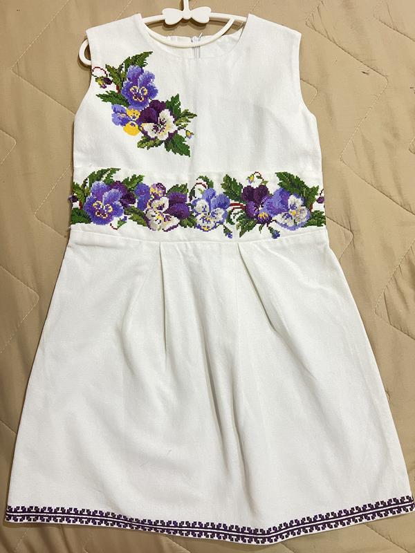 Неймовірна краса 😍 сукня вишиванка на дівчинку з льону з ручною вишивкою, зроблена на замовлення. В ідеальному стані, один раз вдягнули на свято 🎈, ще навіть ні разу на прана. Не знаю 🤷🏻♀️ на який розмір вона йде тому дивіться заміри. ( плюс мінус на 6 років -116 см-122см ) Довжина від плеча до низу - 65 см Напів обхват талії - 32 см ) але можна підтягнути стрічками позаду Дуже вишукана та якісна робота 💙💛