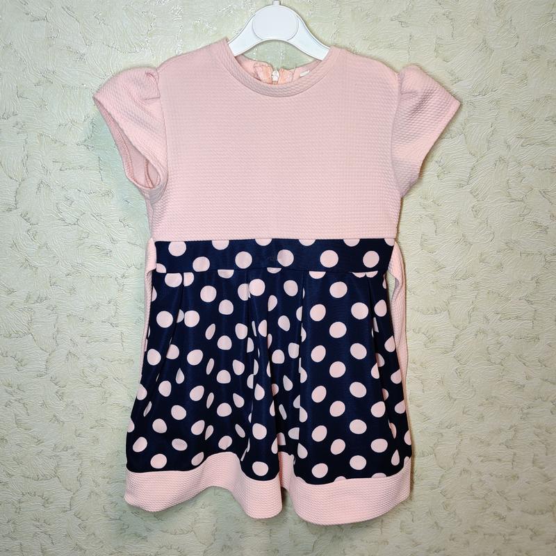 Красивое платье с сочетанием светлого персикового цвета и синего в белый горох Молния на спине, поясок пришит по бокам На бирке указан размер 110 Замеры: длина 53, под руками 31, пояс 30 Хорошо тянется