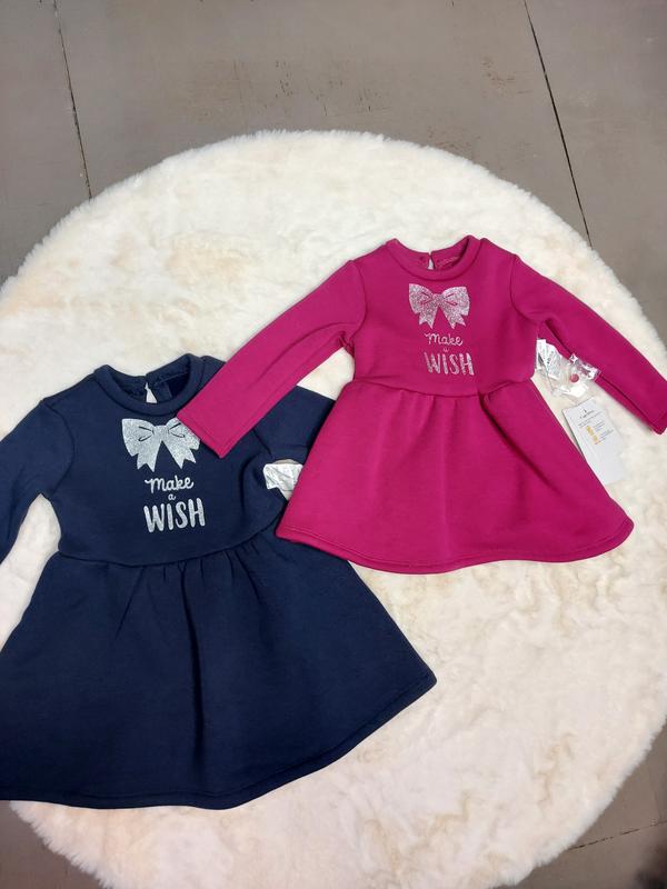 Теплое термоплатье очень хорошего качества,бантики блестящие, блестки не отпадут, сзади на пуговице, удобно надевать и разряжать, верх хлопок, внутрь мех) Замеры розовый р 9_12 плечи 22 рукав 27,в рукав 24 полуобхив туловище на резинке 25 низ 50 длина 41 Замер синее 18_24 мес плечи 24 рукав33,вн рукав 27 пфвобхват тулуба по резинці28 длина 47