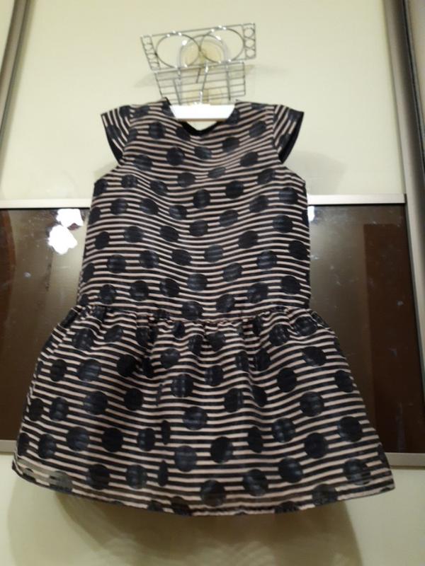 Платье праздничное,Next", в идеальном состоянии. Склад тканини-котон +поліестер, подкладка-полиэстер, , Рукав-крылышко", платье с оборкой, подзади застежка-гудзик, подкладка на всю дол жину. Размер: 5-6/116 Длина-от плеча до самого низа-60см. Длина -от плеча до начала оборки-37см. Длина от плеча до шва, под ручкой (пройма)-16.5см. Длина от проймы (под ручкой) до начала оборки -20см. Довжина оборки-23,5 см. Плечи-24.5см. Об,єм-33.5см. Ширина талии-34.5см. Ширина оборки внизу-58см.