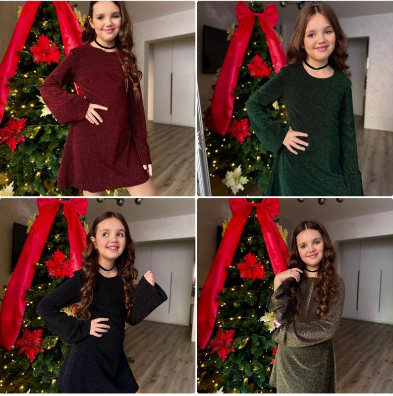НОВОРИЧНАЯ СУКНЯ "ФЕЕРИЯ" 799грн ткань: стрейчевый трикотаж с люрексом Очень красиво сияет! Фото блеск не передает! Застегивается на потайную молнию и имеет шнуровку на спинке для регулировки полноты на талии. ЗАМІРИ: р.140 длина платья/длина рукава/пог 73/57/38см-3шт р.146 длина платья/длина рукава/пог 75/59/39см-3шт р.152 длина платья/длина рукава/пог 77/61/42см-3шт р.158 длина платья/длина рукава/пог 80/62/44см-3шт р.164 длина платья/длина рукава/пог 82/64/46см-4шт Длина рукава указана от плеча!