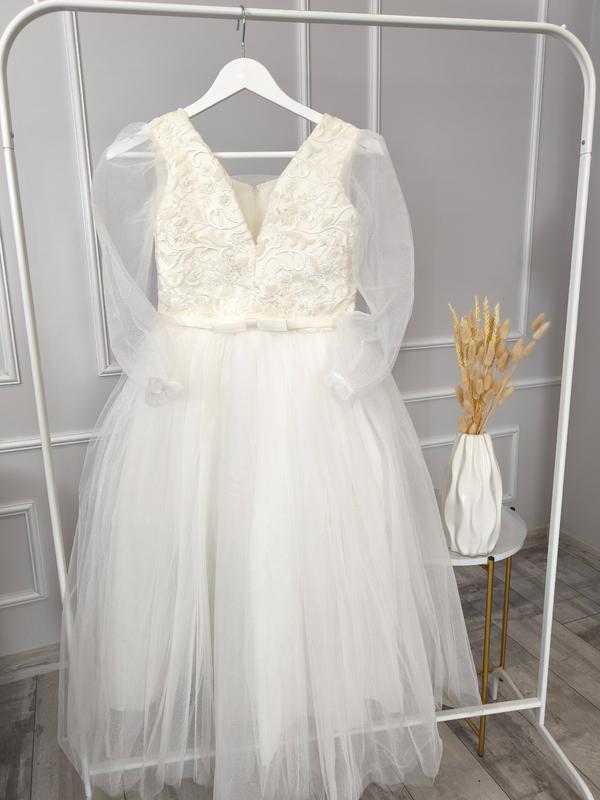 цвет молочный Платье на выпускной и праздничные события: 🌷 Верх фатин, атласная подкладка; 🌷 Сзади замочек и корсет; 🌷 Низ 4 слои фатина и подкладка; Длина/полный обхв. талии 9-12р. 116/ 76 см.