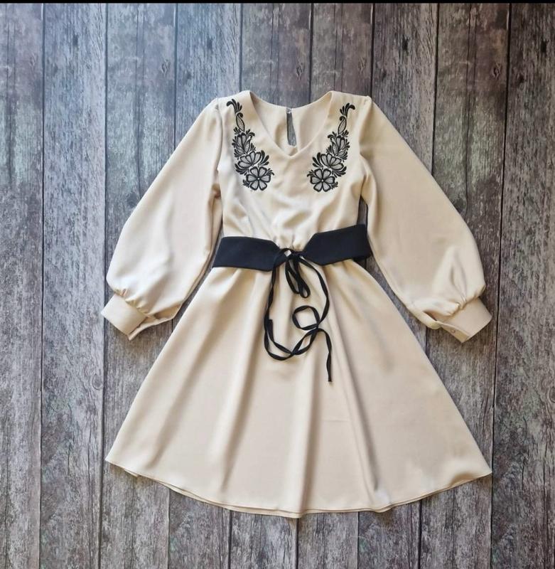 Любите клиенты! ‼️Наложка является только новой по почте по предоплате 200 грн. Укр почта по полной оплате. Безопасной оплаты нет! Перед заказом, уточните наличие! Благодарю ❤️ Платье с вышивкой (не рисунок!) Пясок в комплекті. По спинке застегивается на пуговицу. Манжети на гудзиках. Пояс под резиночку. Ткань -костюмная, хорошее качество. Цвет - бежевый. Цена: 1015 грн. Замеры: 146 длина - 83см, полуобхват груди - 40см, рукав от плеча - 51см. 158 длина - 88см, полуобхват груди - 43см, рукав от плеча - 57см.