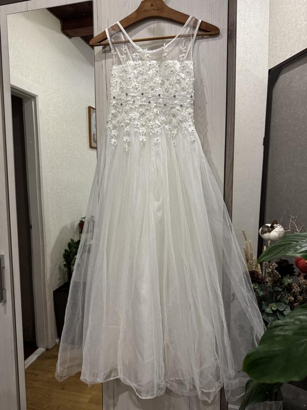 Сукня біленька, з гарними аксесуарами на декольте, ззаду резинка, що підійде на будь-який обʼєм, Є атласна підкладка. Плаття дуже гарне!