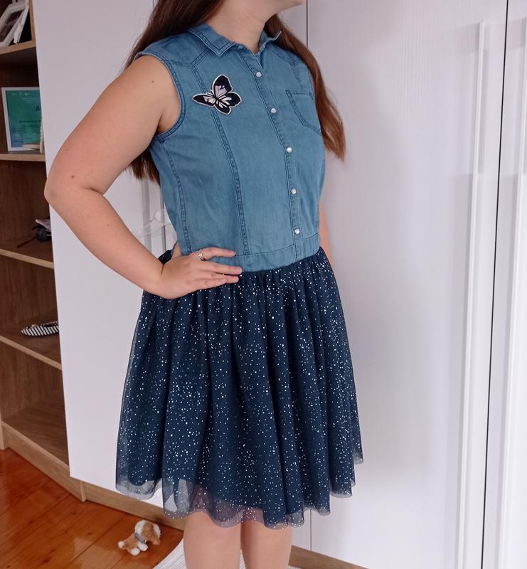 Гарне фірмове, нарядне плаття поєднання джинсу та легкої спіднички з фатіну має блискітки, нове, так і невстигли одягнути, заміри є на фото,