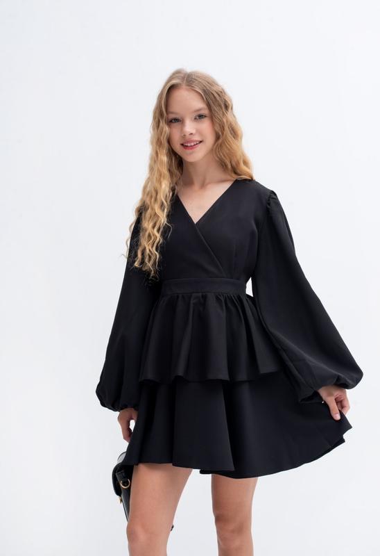 через кнопку купити тільки повна оплата!!! Сукня на запах Пояс пришитий до сукні, зав'язується позаду. Тканина - костюмна. Колір - чорний. Заміри: . 146 довжина - 72см, напівобхват грудей - 39см, рукав від плеча - 57см. 152 довжина - 77см, напівобхват грудей - 43см, рукав від плеча - 60см. 158 довжина - 80см, напівобхват грудей - 44см, рукав від плеча - 64см. 164 довжина - 84см, напівобхват грудей - 47см, рукав від плеча - 67см. Мс