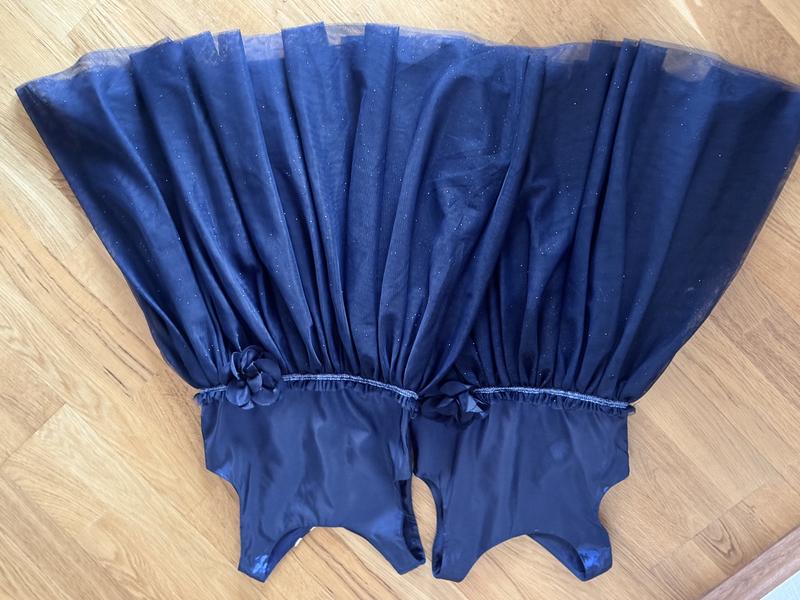 Сукні святкові, темносині, з квіточкою збоку, ззаді застібаються на ґудзики.