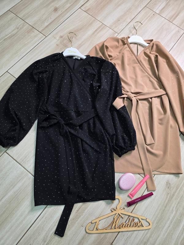 Нежное сияющее платье на запах Пояс в комплекті Ткань трикотажное полотно с креповой структурой, декорировано блеском за счет хрусталиков нанесенных в хаотическом порядке, надежно прикрепленных. Цена 1020 грн Бежевая,черная 146-1шт 152-1шт 158-1шт 164-1шт 170-1шт