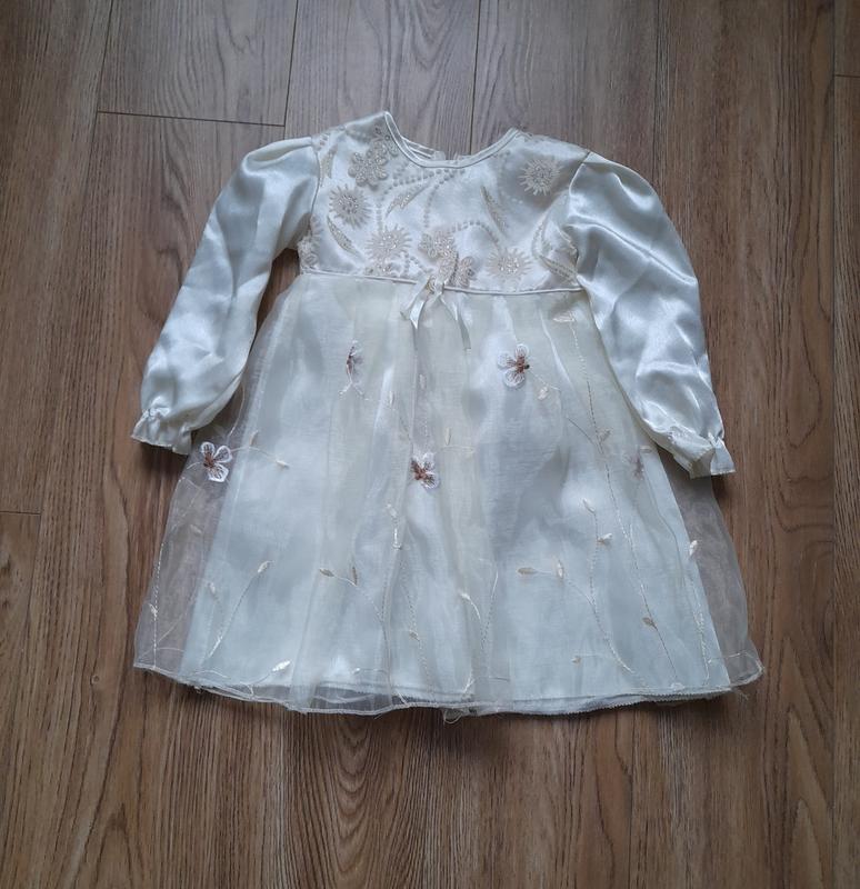 Платье праздничное, платье на возраст 2-3р. 98см., можно и дольше, ориентируйтесь по замерам: длина от плеча до низа 49см., ПОГ 24см., рукав от плеча 30см., рукав от горловины 36см. Цвет молочный, рукавчики на резиночке, сзади поясок, можно завязать бантик, застежка на замочке. Безопасная оплата возможна укр и новой почтой.