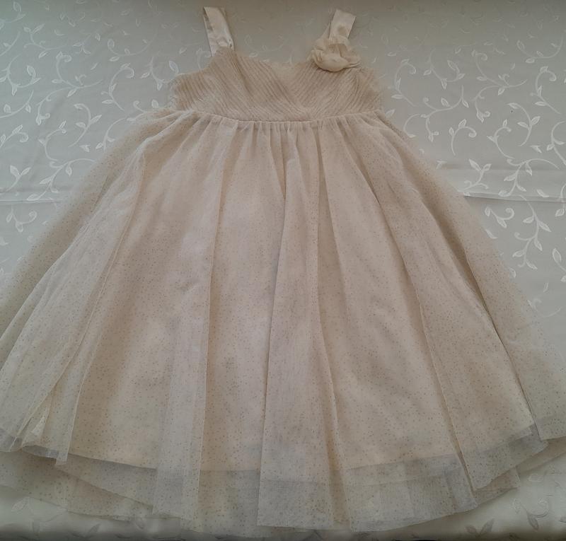 Дуже гарна святкова сукня H&M кремового кольору в чудовому стані, розмір 128 (7-8 років), підкладка повністю з натуральної тканини. Довжина - 75см (з фатином), півобхват грудей - 32см.