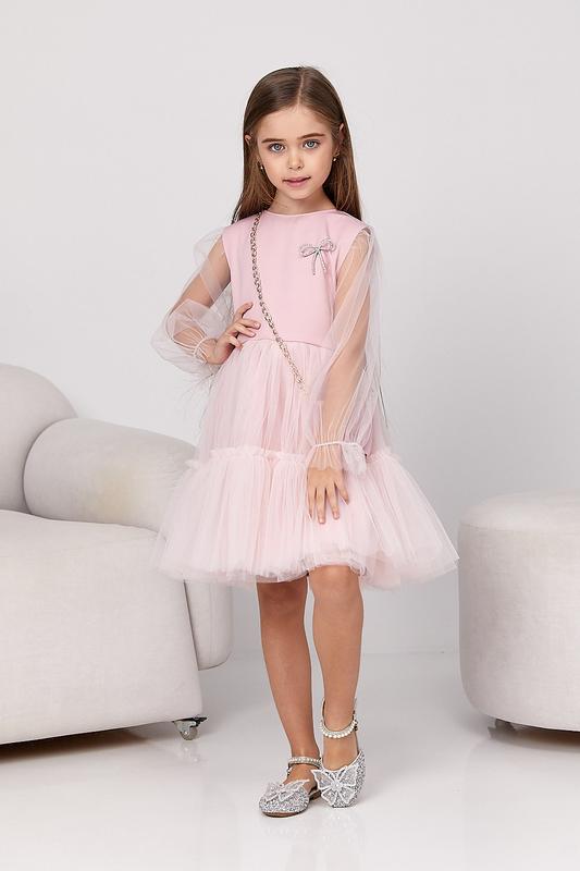 Святкова сукня з фатиновими рукавами та пишною фатиновою спідницею Застібається на блискавку на спині На поясі фатинові зав'язки В комплекті маленька сумочка з тканини на золотистому ланцюжку