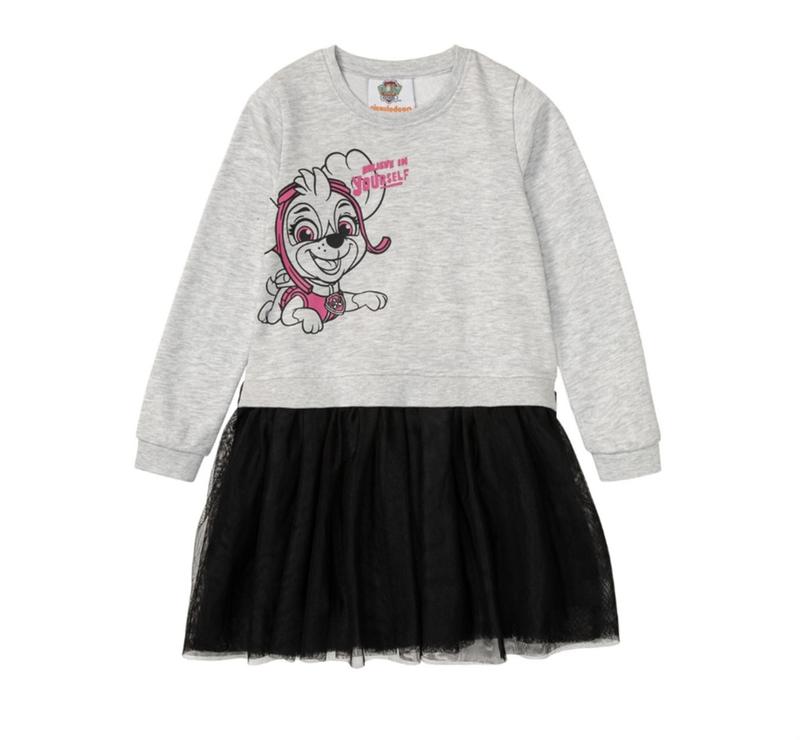 Платье для девочки с юбкой из фатина с принтом Paw Patrol. Из двунитки. Круглый вырез горловины, манжеты в рубчик на конце рукавов. Длинные рукава, юбка притачная из фатина. Ecoprint – 100% экологическая текстильная печать. Замеры: рукав от плеча 37см, длина общая 52см, по подмышкам 27см Состав: верх: 70% хлопок, 28% полиэстер (переработанный), 2% вискоза (вискоза от Lenzing); юбка: 100% полиэстер (переработанный)