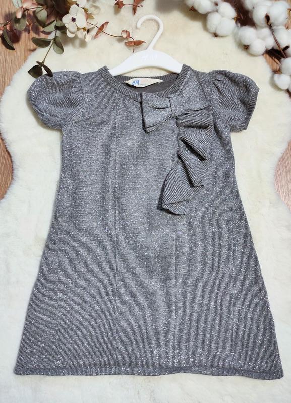 Праздничное блестящее платье с бантом от бренда H&M для девочки в возрасте 2-4 года, на рост 98-104 см 🩶👗🎀 Лаконичный крой, нарядный серебристый цвет, ткань имеет красивый праздничный блеск благодаря люрексовой нити.✨ Отличный состав - 87% хлопок, 7% полиэстер, 5% металлизированная нить Замеры: Длина 51 см Плечи 24,5 см Ширина под рукавами 30 см Внутри без подкладки.