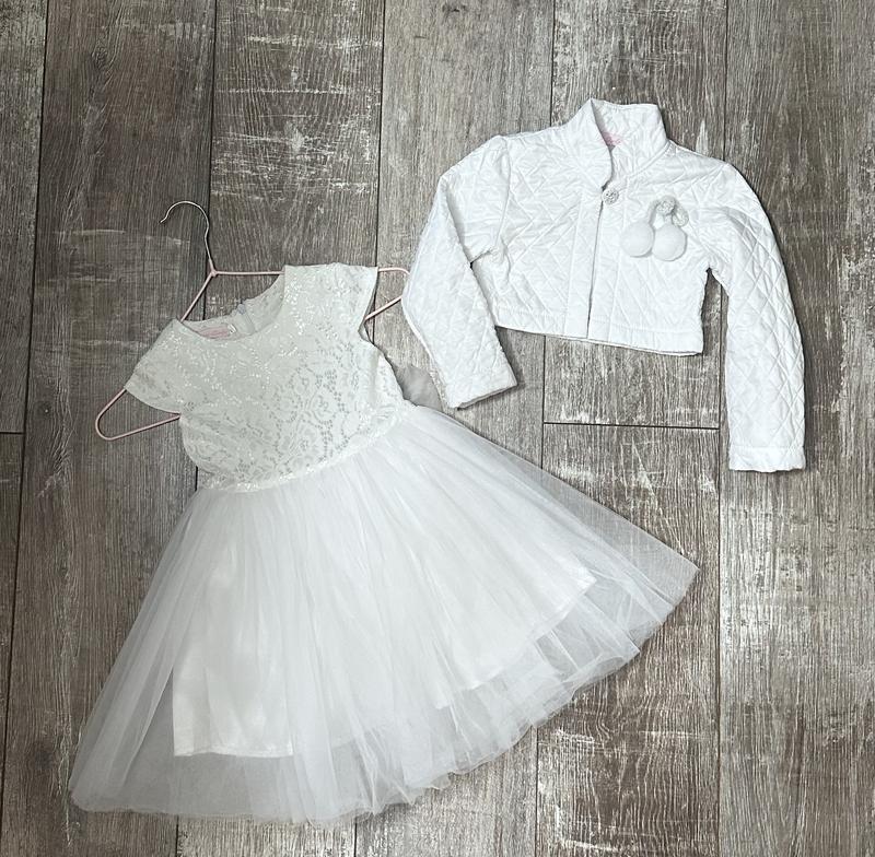 Святкова сукня 104р. Заміри: сукня- довжина 59см, ширина 25см. Жакет: рукав 36см. Стан відмінний.