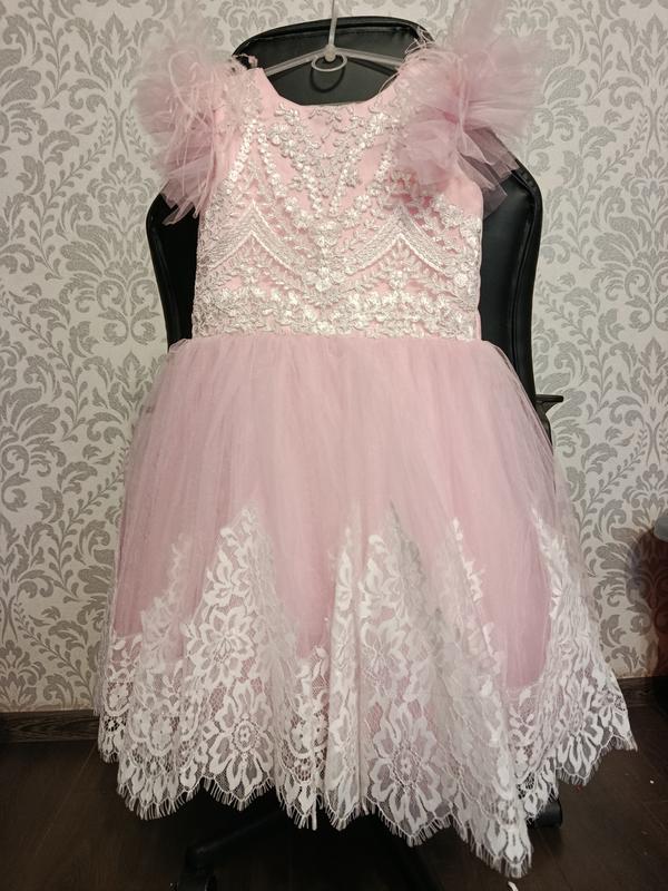 сукня в гарному стані одягались пару раз, позаду змійка, талія регулюється шнурівкою, бантик знімається красить на шпильки( за по треба можна в ательє якось переробити, але нам було нормально так користуватись)