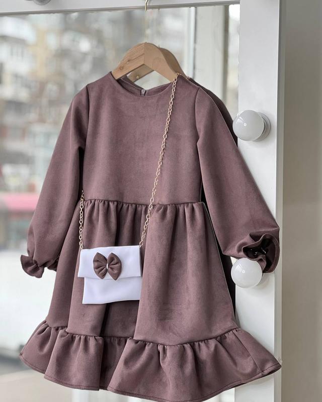 Праздничное красивое платье🌸🌸🌸 ноая цвет - молочный шоколад ▪️ткань замш на дайвинге ▪️сумочка в комплекте ▪️ткань немного тянется, сзади молния. ▪️очень красиво смотрится на девочках Замер по одной ростовке, поэтому могут быть погрешности 🔻98- вся длина 52 длина до пояса 23 рукав 34 ширина 28 🔻104- вся длина 57 длина до пояса 24 рукав 36ширина 28 🔻110- вся длина 58 длина до пояса 24 рукав 37 ширина 29 🔻116- вся длина 62 длина до пояса 24 рукав 39 ширина 30 🔻122- вся длина 63 длина до пояса 26 рукав 42 ширина 31 🔻128- вся длина 64 длина до пояса 27 рукав 44 ширина 32 модель ШМ
