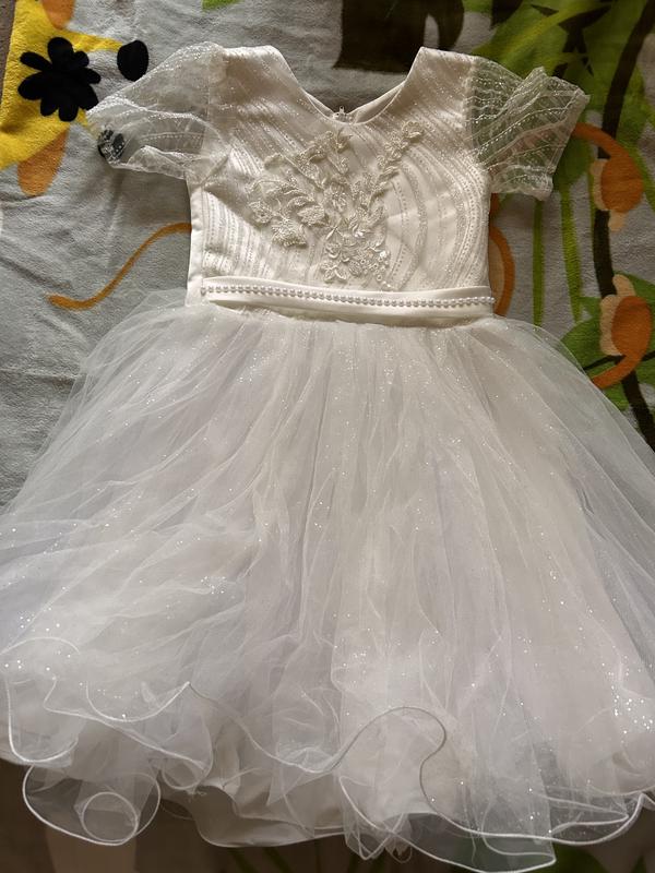 Святкова сукня на дівчинку 4-5 років. Дуже гарна. Напів обхват по грудях 32 см. Довжина по спині 77 см. На спинці йде замочок. До сукні йде болеро барашок.