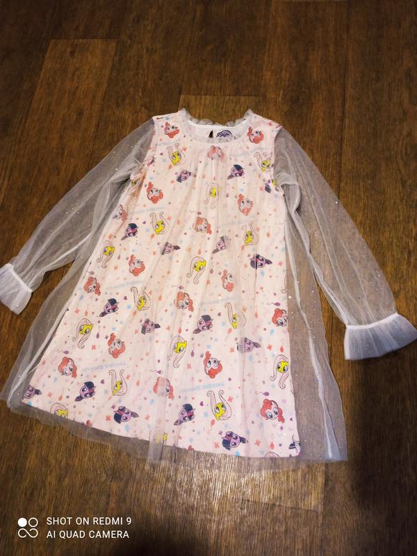 платье нежное, низ трикотаж, верх фатин, фатин весь в блестках. очень нежное. состояние новая вещь. длина 64 см.
