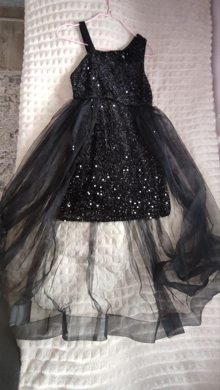 праздничное платье черного цвета необычного дизайна. Нижнее часть - силуэтное платье в пайетках с асимметричным верхом. Юбка к полу из фатина. Несъемная. Платье с подкладом, мягкое, не колеблется. Стильная и утонченная, удобная для движений. Подойдет для девочки 8-12 лет в зависимости от роста. Замеры вышлю дополнительно. Заводской размер 160 по бирке. Соответствует где-то 146 нашему.