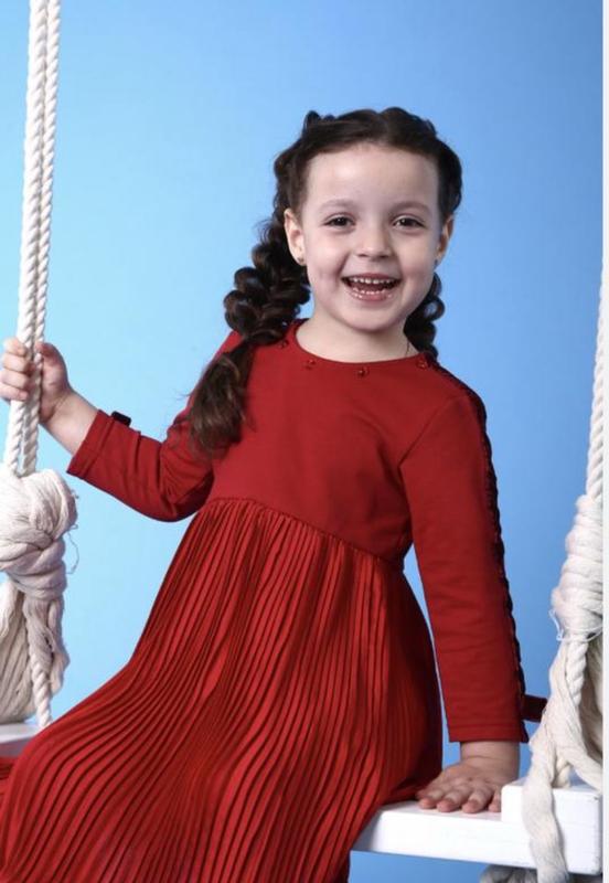 Красное платье с юбкой плиссе, по линии плеча платье декорировано бархатистой лентой, а на рукавах украшена бантиком. В качестве декора вокруг горловины-сияющие стразы в тон платья. Материал: 80% хлопок 20% полиэстер. Длина - см, ширина