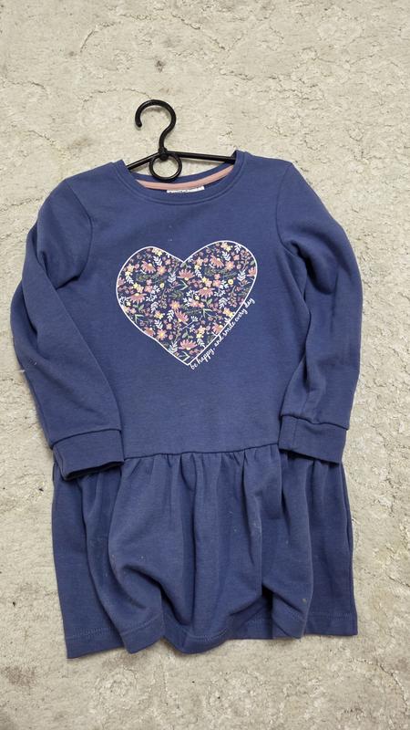 Ось гарний та лаконічний опис для Шафи: Синє трикотажне плаття для дівчинки, зріст 110 116 см. М’яке, зручне — ідеально для садочку чи щоденного носіння. Має довгий рукав і пишну спідничку. Спереду красиве велике серце з квітковим принтом. Стан дуже хороший, без плям і дефектів. Підійде на 5–6 років. Готове до носіння ❤️
