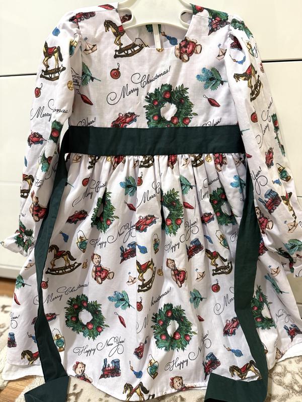 Одягнена один раз на свято. Дуже милий принт, святковий, різдвяний. Заміри: Сукня біла плечі 25, під руками 33, рукав 45,пояс 32, довжина Верхня юбка 64. Нижня 66,5