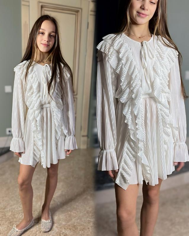 Неймовірно гарна сукня Тканина: плісе нейлон-стрейч Підходять на будь-яку фігуру, в талії резиночка. Заміри: Рукав від плеча/довжина/пог 134 - 50/64/34 140 - 52/66/35 146 - 55/76/36 152 - 56/78/37 158 - 58/80/38
