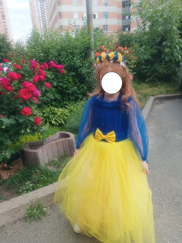 Яркое, красивое и оригинальное платье девочки 6-7 лет. В идеальном состоянии, как новая платье с длиной 94 см. Подойдет на деток 5-7, так как платье сзади со шнуровкой. Замеры: по груди максимально 66 см, шнуровкой затягивается до 54 см. Платье нигде не давит, объем по груди и по талии Вы можете отрегулировать сами. Талия = 64 см, затягивается до 54 см. Длина спинки= 29 см, длина юбочки= 65 Платье имеет 5-ти слойную юбочку. В подарок капроновые колготы и обруч