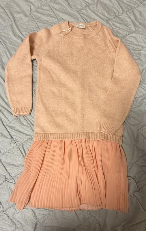 Сукня тепла на дівчинку 8-9 років, на зріст 128-134, приємного персикового кольору. Під шифоновою спідничкою є підкладка. Нова, але без бірки.