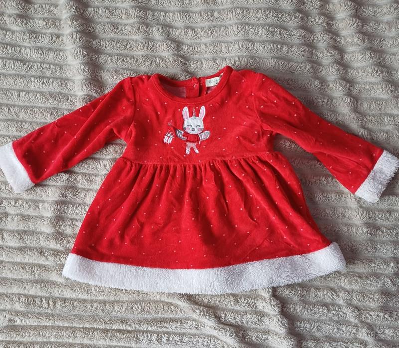 Платье новогоднее с зайчиком. На возраст 18-24 мес. Замеры : Длина- 41 см Полуобхват талии - 30 см Рукав с плечом 35 см. Сзади на кнопках.