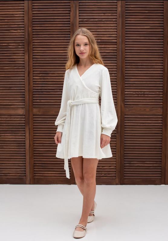 через кнопку купить только полная оплата!! Стильное платье для модниц По спинке к поясу застегивается на молнию. Спереду на запах. Пояс в комплекте. Ткань королевский велюр, мягкий и нежный. Цвет- Молочный. Замеры: 152 длина - 79см, рукав от плеча - 57см, полуобхват груди - 41см 164 длина - 87см, рукав от плеча - 63см, полуобхват груди - 45см Мс