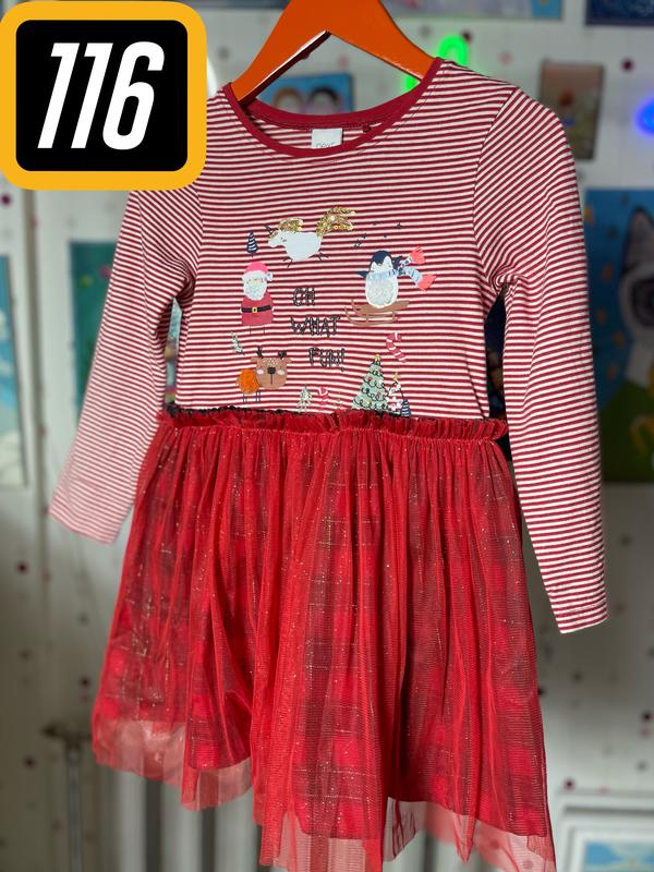 Святкова сукня для дівчинки з новорічним принтом. Верх у червоно-білу смужку з милими різдвяними героями та написом Oh what fun!. Низ — пишна спідничка з фатину з легким блиском, виглядає дуже нарядно ✨ Ідеальний варіант для садочка, свят, фотосесій та новорічних заходів. Стан дуже хороший, без плям, дірок чи пошкоджень. 🧩 Верх — 100% бавовна. Спідниця — поліестер, підкладка бавовняна. 🏷️ Розмір: 5–6 років, зріст 116 см. 💰 Ціна — 350 грн. Заміри по запиту 🫶
