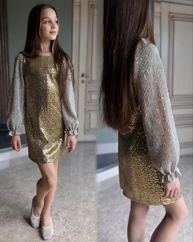 Неймовірної краси сукня Тканина: трикотаж-діско з пайетками та напиленням ,на підкладці,тягнеться По спинці боискавка Дуууже гарне і святкове 134см 140см 146см 152см Мд Заміри: рукав від плеча/довжина/пог 134 - 48/64/32 140 - 50/68/33 146 - 52/71/34 152 - 55/73/35