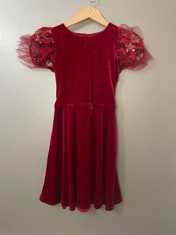 Праздничное платье для девочки На рост 152(11/12 лет) Состояние новой, присущая бирка Темный красный/бордовый цвет Замеры пог 36 длина 46,5 Талия 30 Длина верх.части 33 см