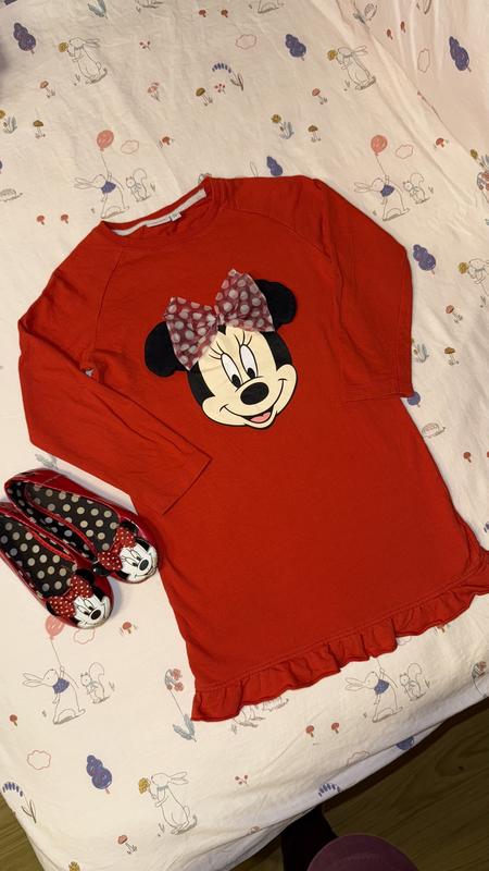 Бавовняна сукня, тканина двонитка. Оздоблено наліпкою Мінні Маус з обʼємним бантиком та рюшею по низу. У подарунок балетки. Червоного кольору.