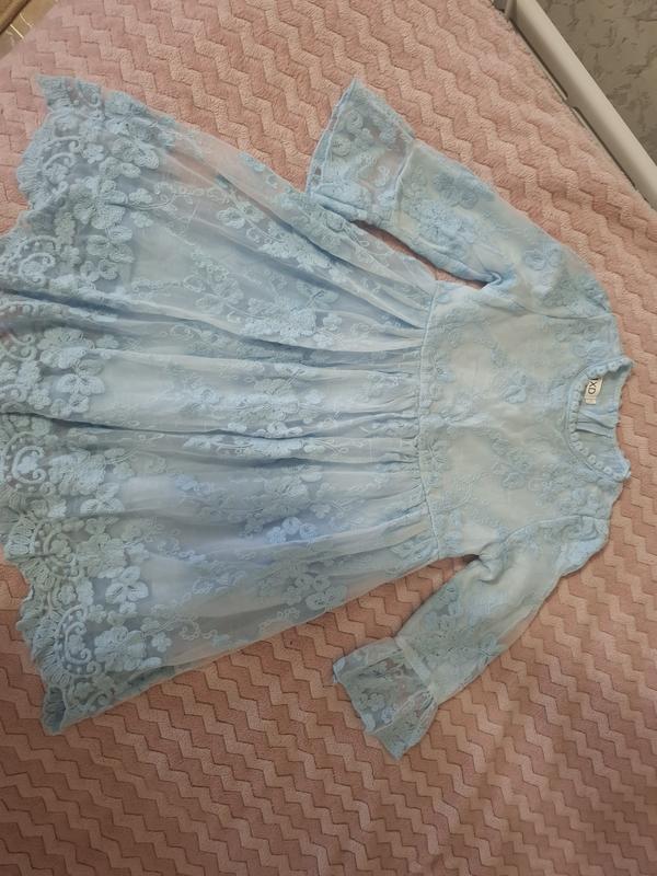Очень нежное и красивое платье для девочки, из кружева, голубого цвета. Рукав 3/4. Размер где-то 110-116, смотрите замеры на фото. В идеальном состоянии.