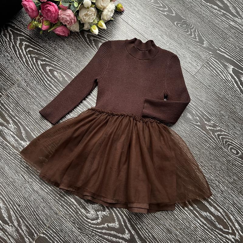 Вʼязана шоколадна сукня для дівчинки / сукня з фатину / коричнева вʼязана сукня
