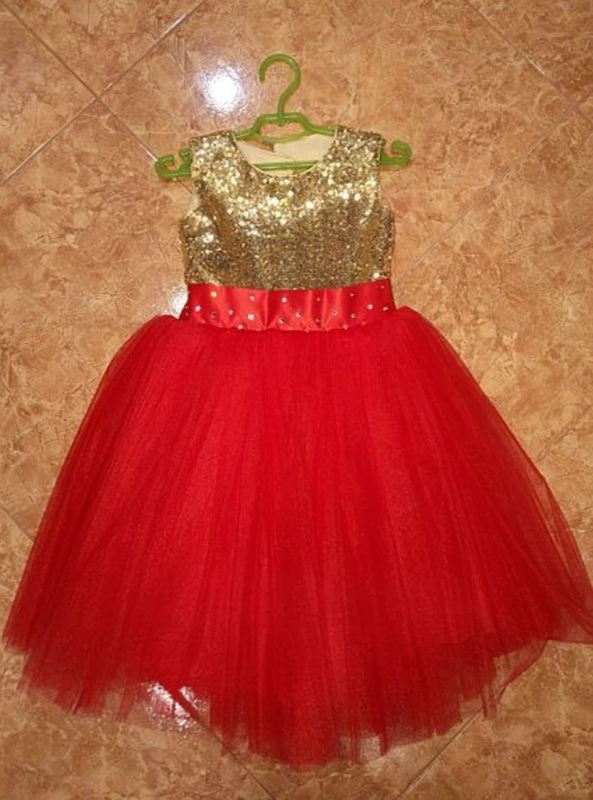 Очень красивое праздничное пышное платье. Размер 5-7р. Верх -золотые пайетки, на спинке вырез, застегивается на скрытую молнию+ есть шнуровка+ пышный бант, который отстегивается. Пояс расшит камушками. Одета один раз на выпускной в садик.