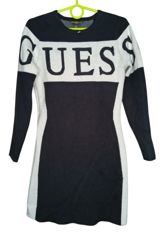 Платье с подписью Guess kids, черного цвета. С широкой белой полосой спереди и сзади с логотипом Guess . Оно с длинными рукавами, круглым вырезом и стандартным кроем. Оно удобное, мягкое и очень эластичное. На 8 лет.. замеры на фото
