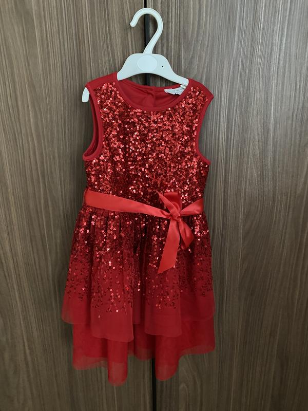 Дитяча сукня червоного кольору з паэтками та фатіном з атласним бантом -поясом, спинка на ґудзиках, спідничка відрізна з трьома шарами фатіну та підкладкою. Фірма Primark. На вік 5-6 років, на ріст 110-116 см. ПОГ 31 см, ПОТ 30 см, довжина по спинці до пояса 24 см, загальна довжина по спинці 65 см.