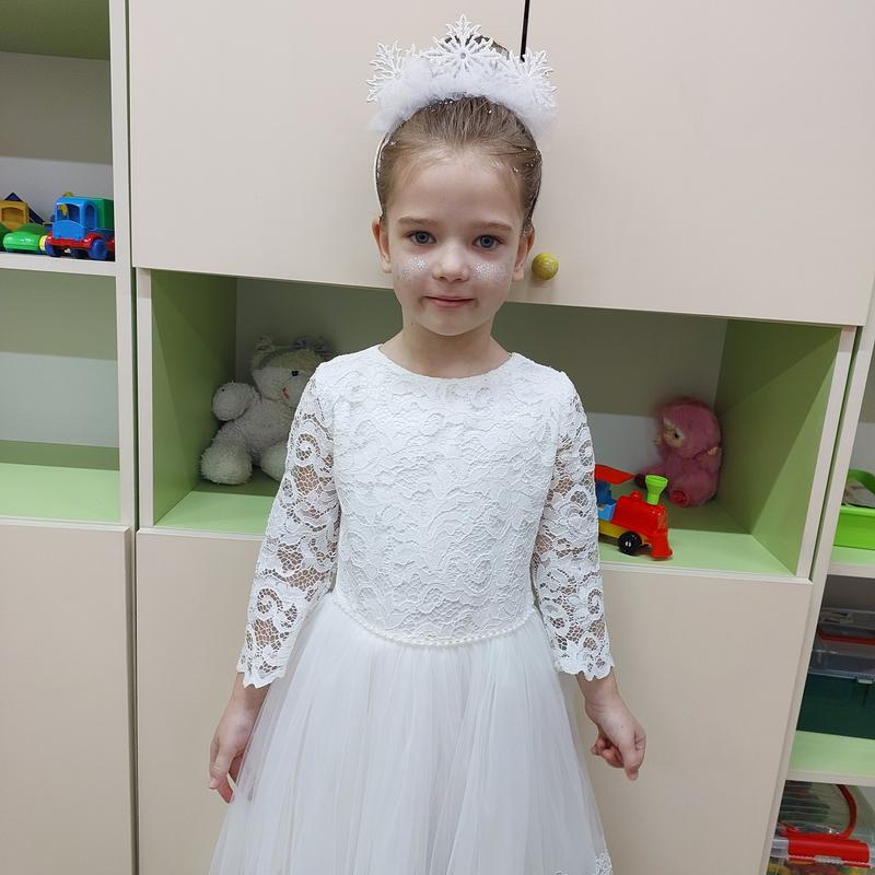 Платье подойдет как новогодний костюм, так и как платье на праздник. Подойдет на размер 110-116. Есть два дефекта. На нижней атласной юбке и на фатине, не заметны. При глажке тики заметно. Для образа снежинки или зимы надам обруч.