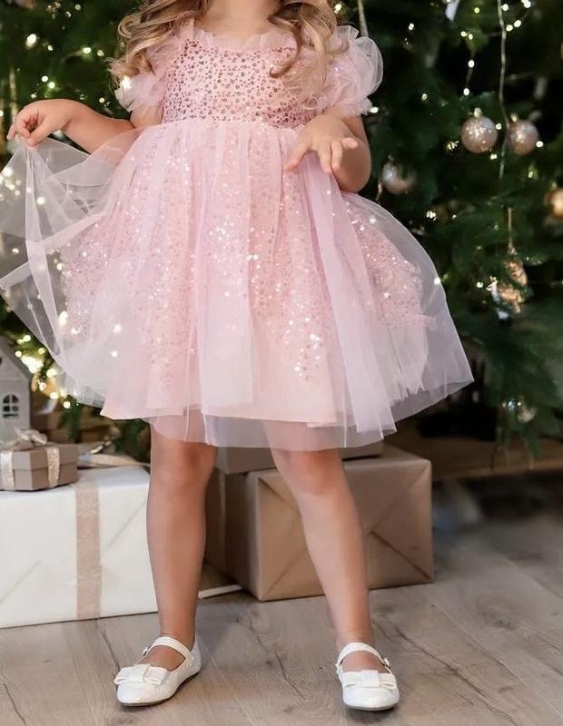 красива сукня прикрашена паєтками. Два шари фатіну+ додатково шар з паєтками між ними. До тіла котонова підкладка. Застібка на змійку. 90-Довжина 48(до підкладки) від плеча, ширина під руками 26см, рукав 12см. 100-Довжина 48 (до підкладки), ширина під руками 28см, рукав 13см. 130-Довжина 62 см (до підкладки), ширина під руками 30, рукав 15см. 140-Довжина 66 см (до підкладки), ширина під руками 31см, рукав 15см