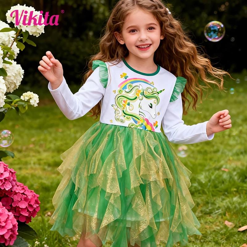 Детское трикотажное нарядное нарядное платье для девочки. Платье с длинным рукавом и фатиновым (тюлевой) юбкой, украшено принтом единорога и оборками. р.116, 5-6 лет: рукав от плеча 39, длина 67, ширина груди (ПОГ) 32