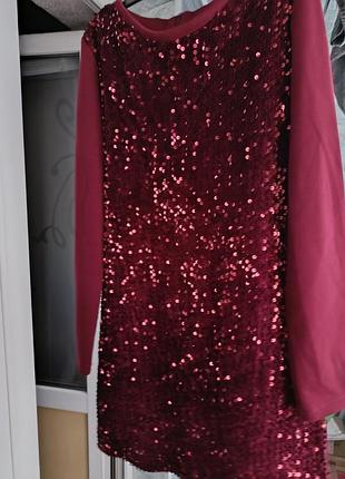 Бордовое нарядное платье с пайетками на рост 158.Позаду на молнии.Длина платья 76 см, длина рукава 54 см, ПоГ 37 см.Пайетки переливается.В красивом состоянии.